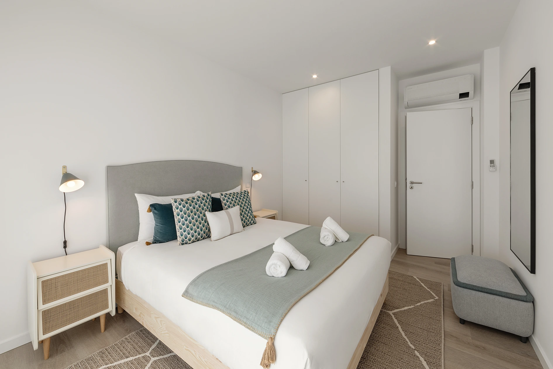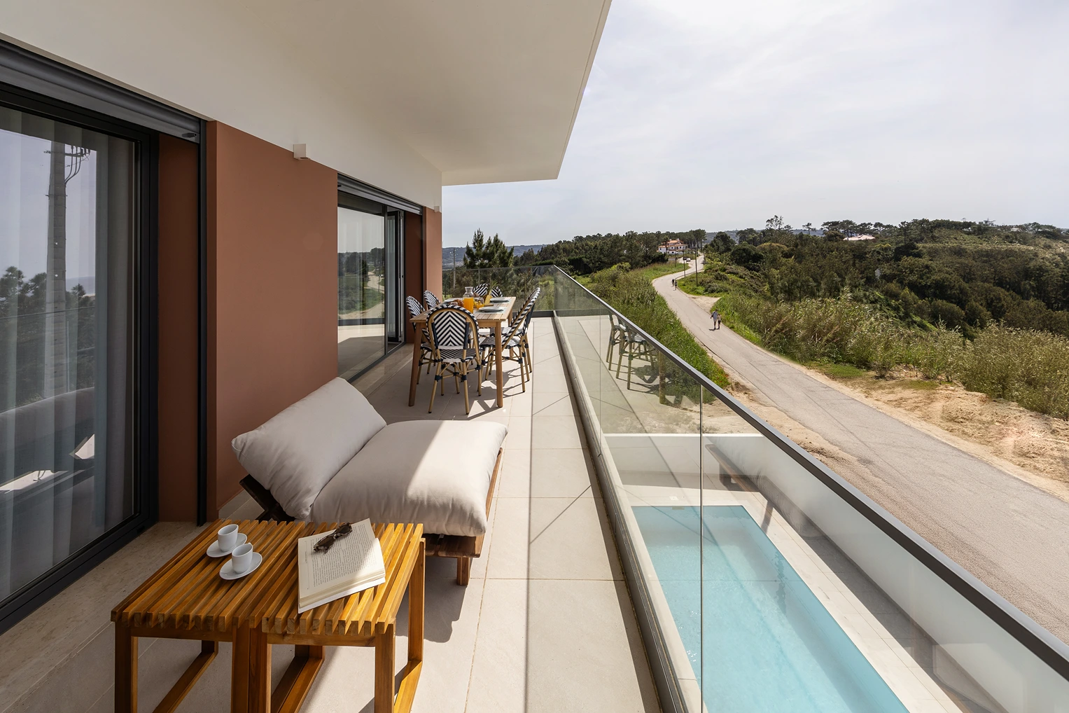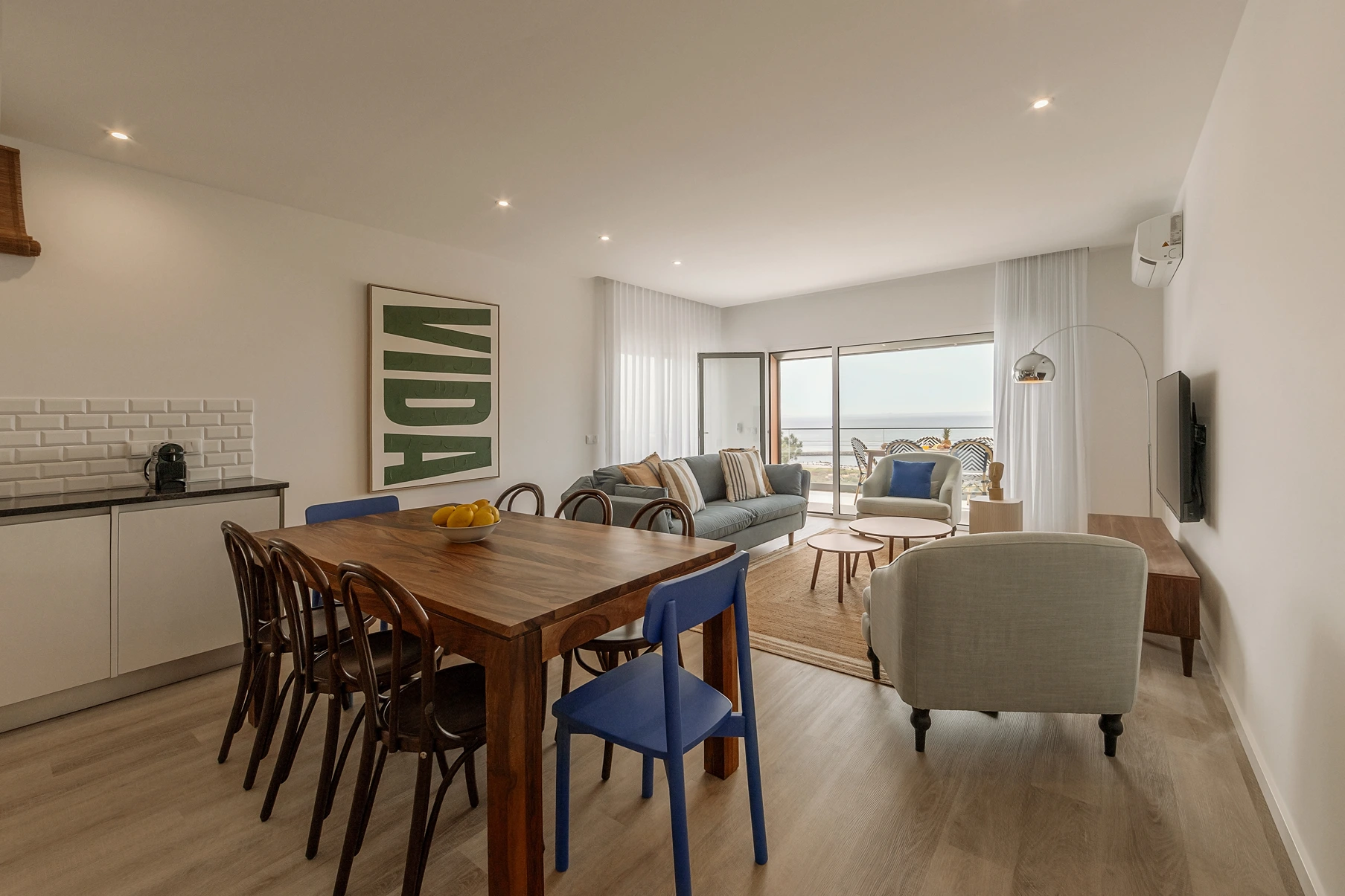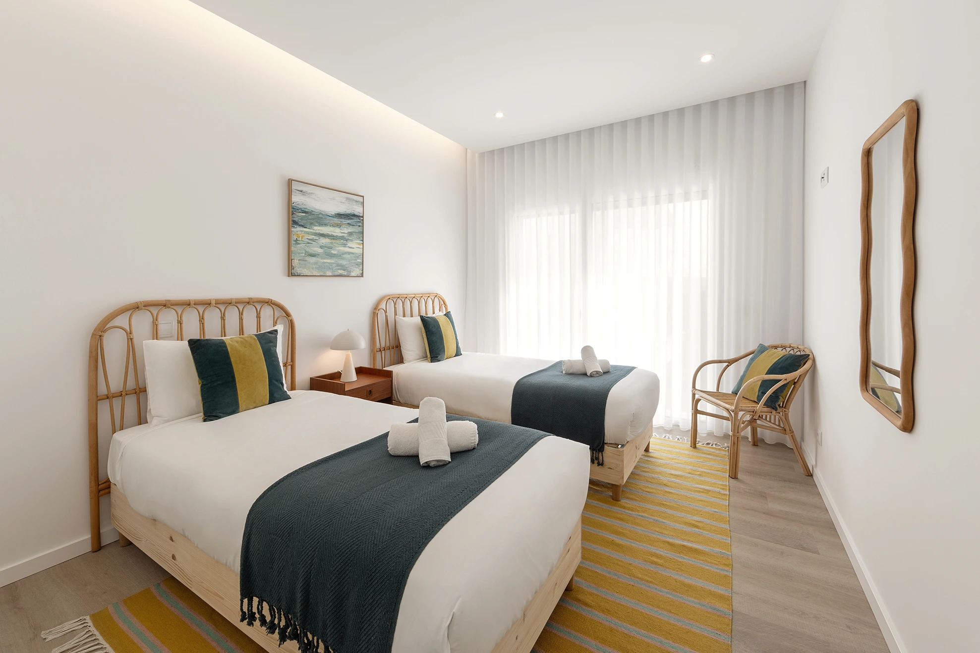 Materiais orgânicos como madeira, palhinha e fibras naturais predominam. A paleta de cores é inspirada pela envolvente: tons areia, azuis, verdes e branco que refletem a luz natural abundante e que reforçam a sensação de tranquilidade.