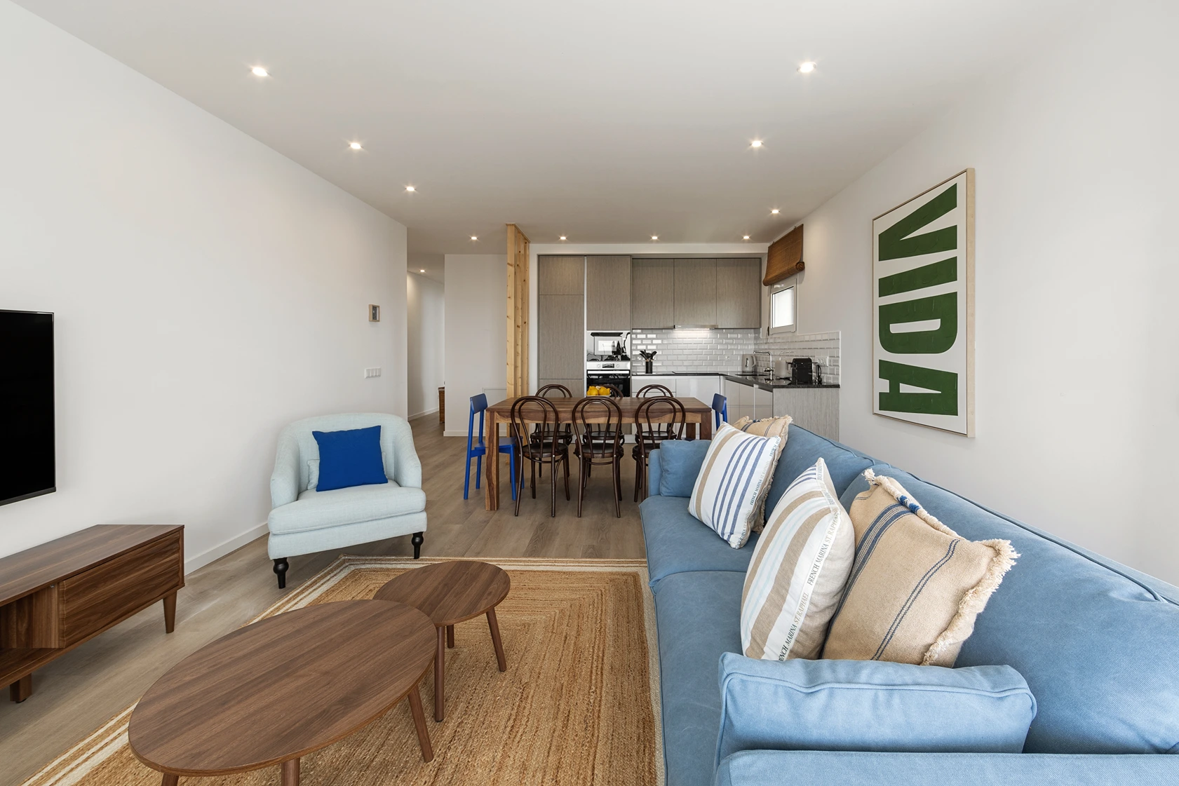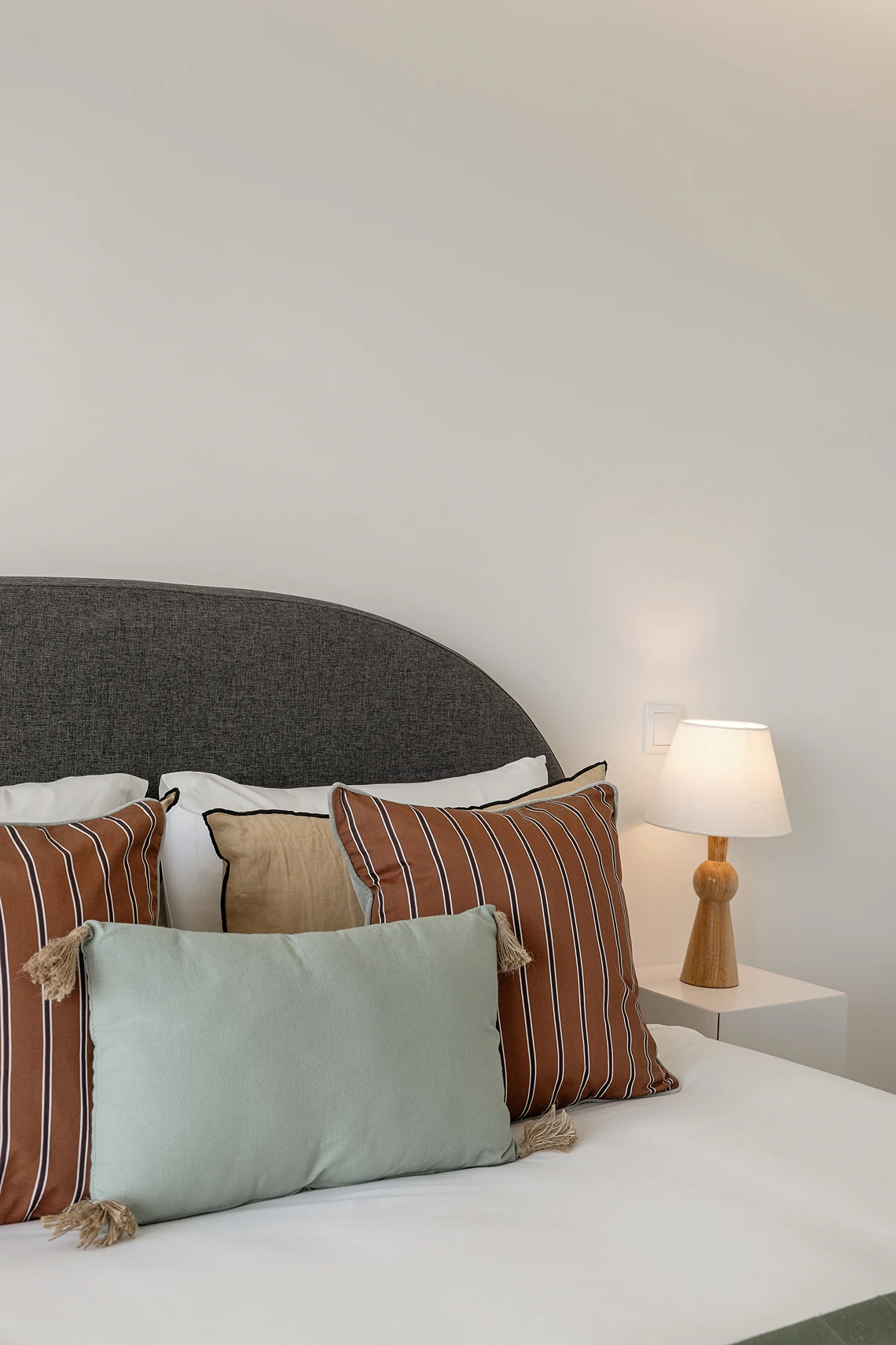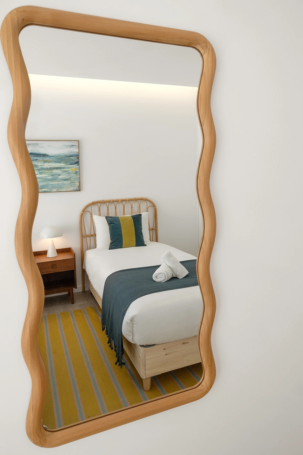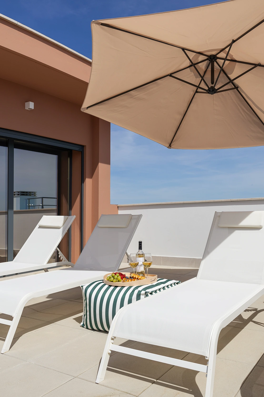 Materiais orgânicos como madeira, palhinha e fibras naturais predominam. A paleta de cores é inspirada pela envolvente: tons areia, azuis, verdes e branco que refletem a luz natural abundante e que reforçam a sensação de tranquilidade.
